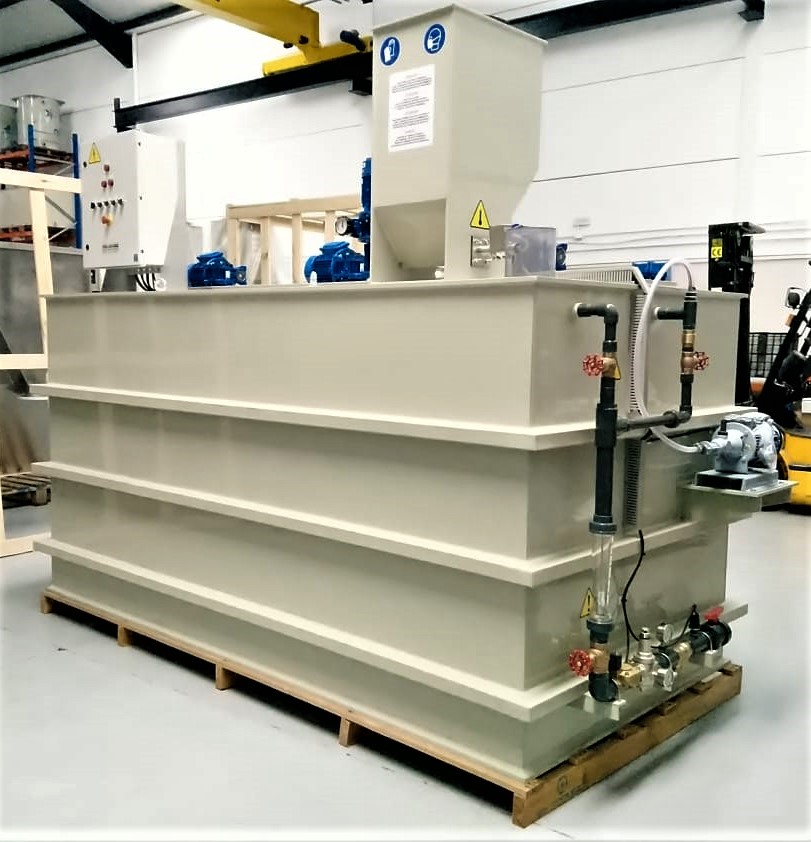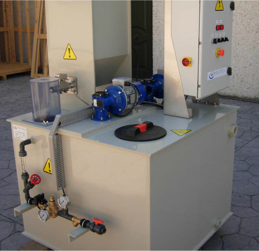 Está formado por un depósito divi­dido en dos o tres compartimentos agitados, un dosificador, un colector de agua de entrada y un cuadro de control.