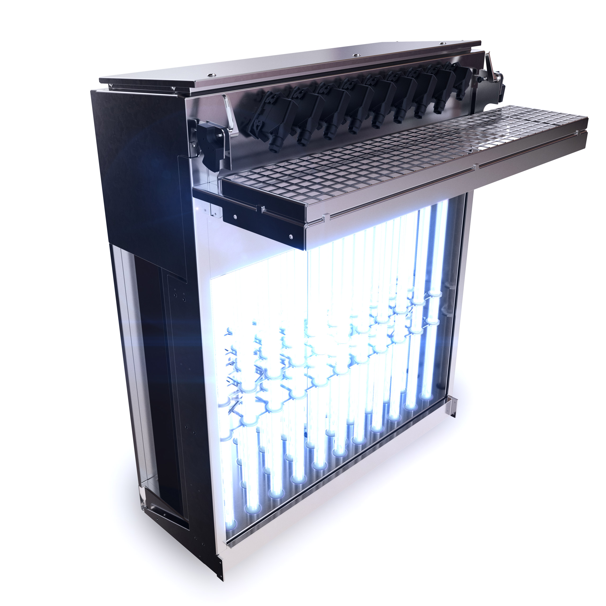 El material de acero inoxidable electropulido AISI316L garantiza una resistencia avanzada a la corrosión del recipiente y una longevidad general. El diseño fácilmente escalable permite un alto nivel de versatilidad de construcción para tratar flujos de cualquier tamaño. El diseño del banco de lámparas con un compartimento superior seguro y sin herramientas que requieren mantenimiento proporciona al usuario una comodidad operativa excepcional, especialmente en instalaciones de múltiples bancos de lámparas y para proyectos a gran escala.