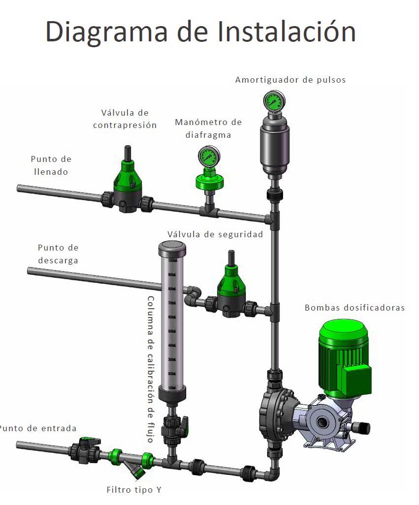 Alivio: libera el exceso de presión cuando esta supera un valor definido, protegiendo la bomba dosificadora y la tubería.
